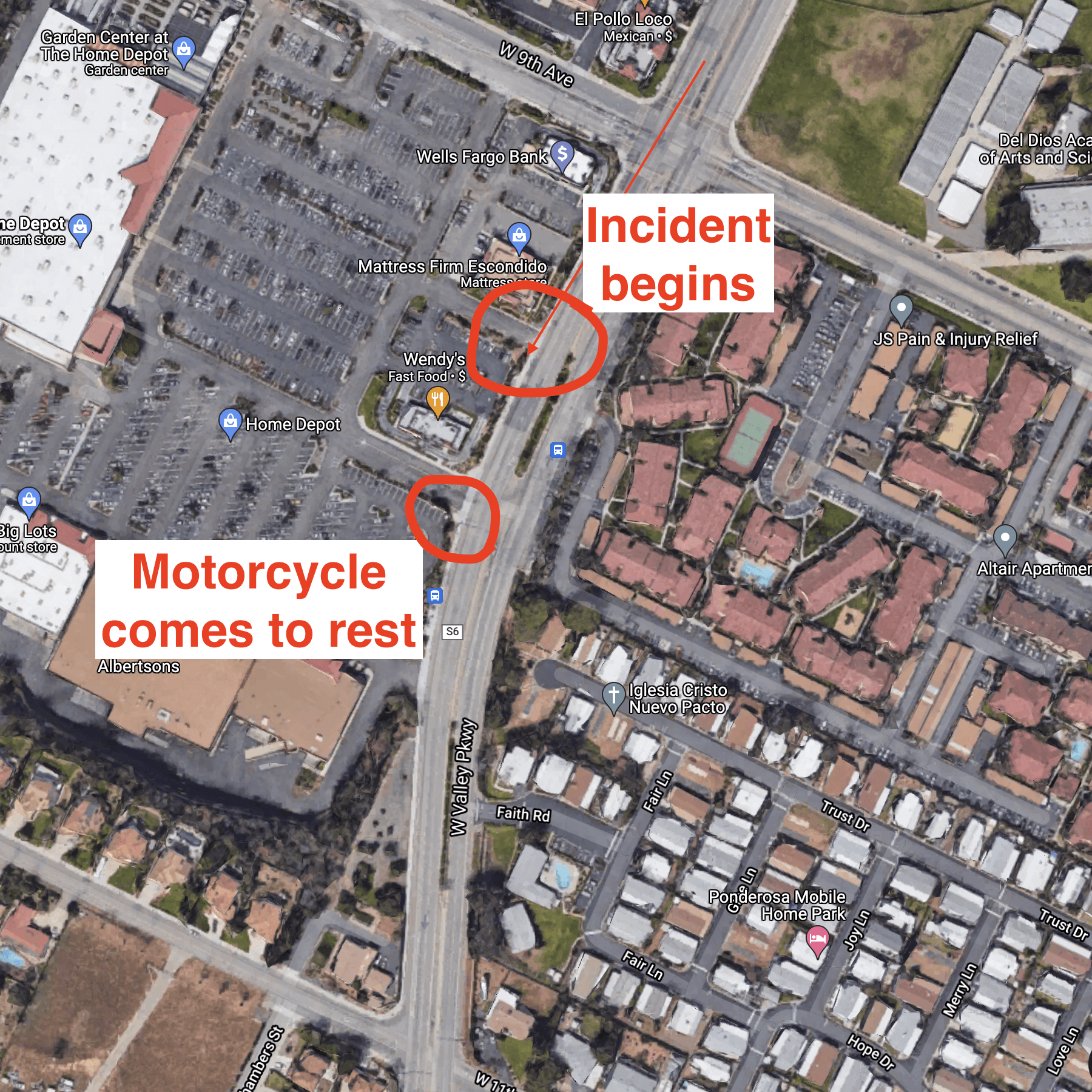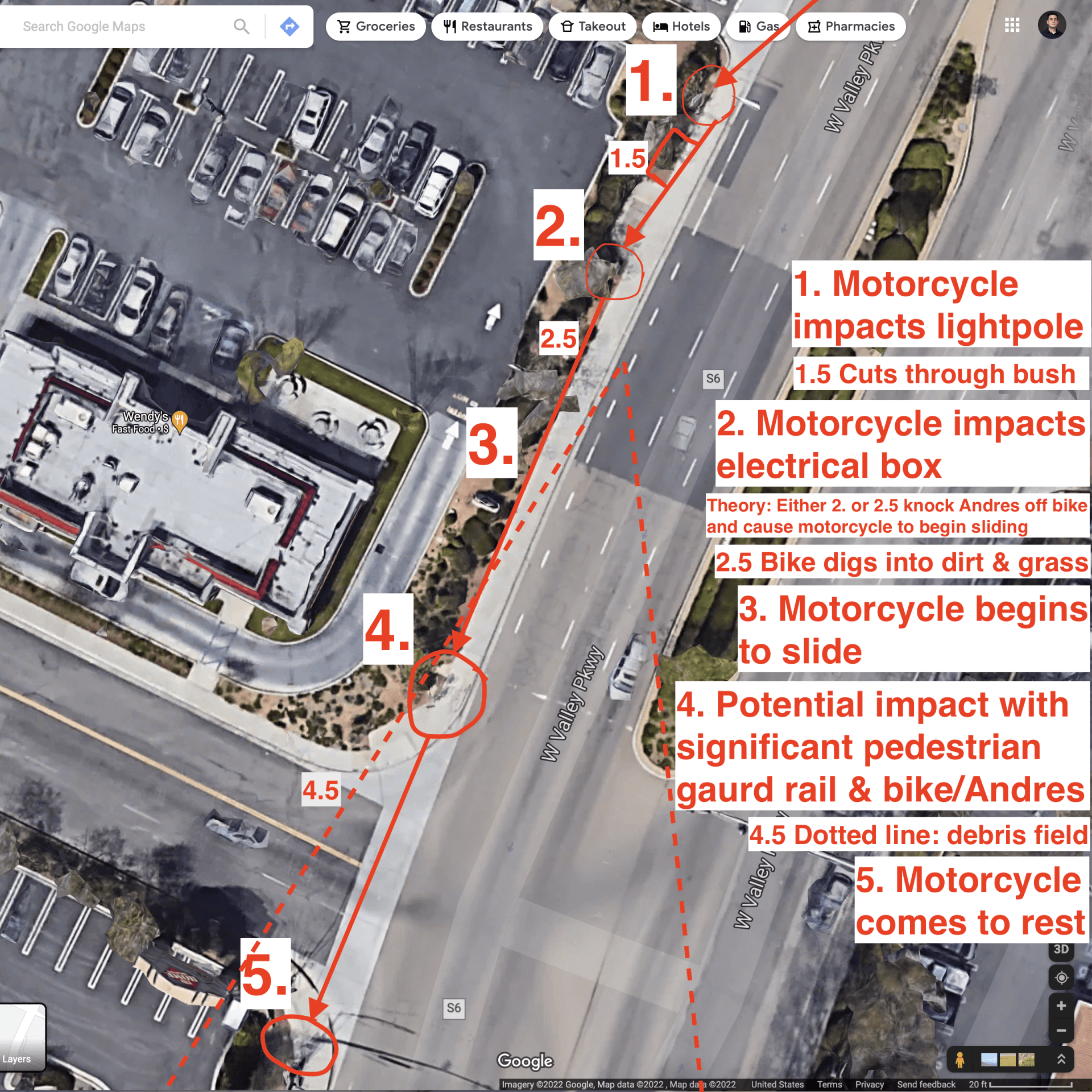 At the scene of the incident, debris was scattered everywhere suggesting at least one violent and traumatic impact in addition to the fallout of the accident (motorcycle sliding, flipping, rolling, etc...). Although the fate of Andres' wrecked bike is unknown, a broken peg, part of the seat assembly, part of the windscreen, and part of Andres' helmet were recovered.